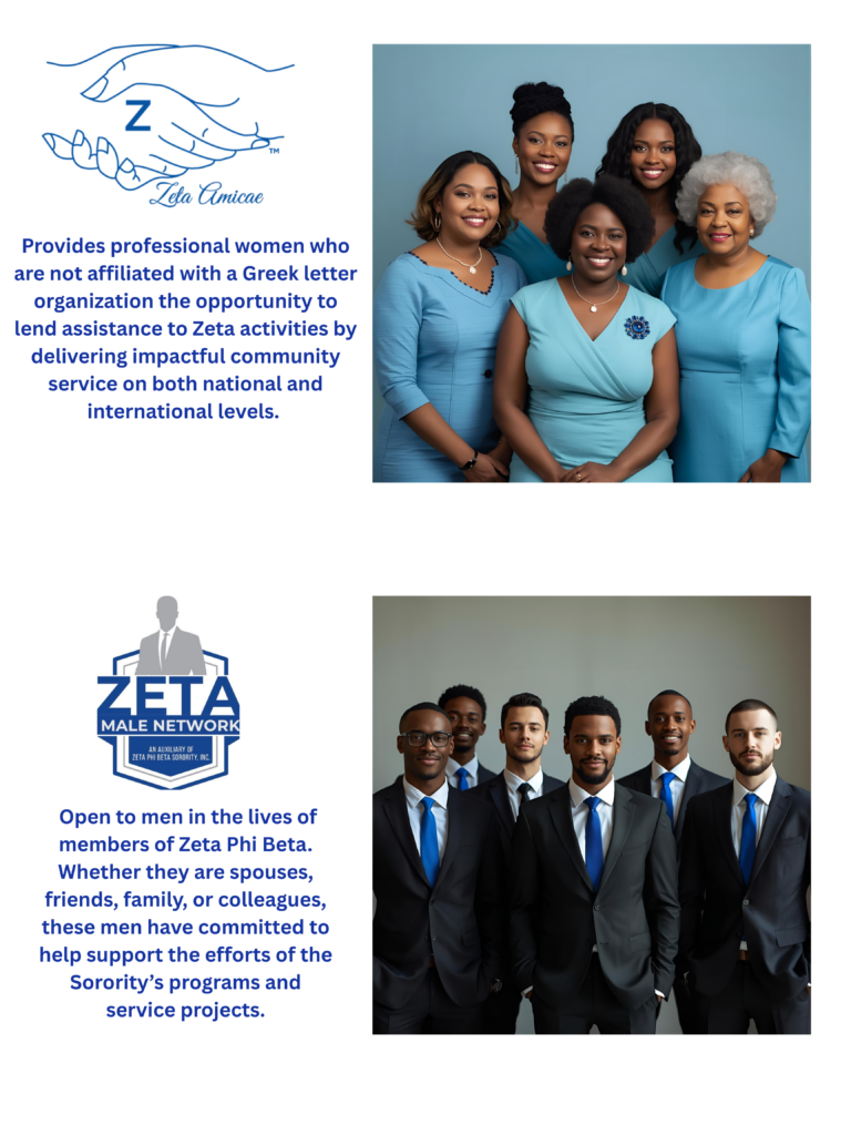 Zeta Phi Beta Sorority, Incorporated’s auxiliary groups, including Amicae and the Zeta Male Network, play a vital role in supporting the sorority’s mission and programs. Together, these auxiliaries strengthen the organization, promote civic engagement, and foster the growth of future leaders.